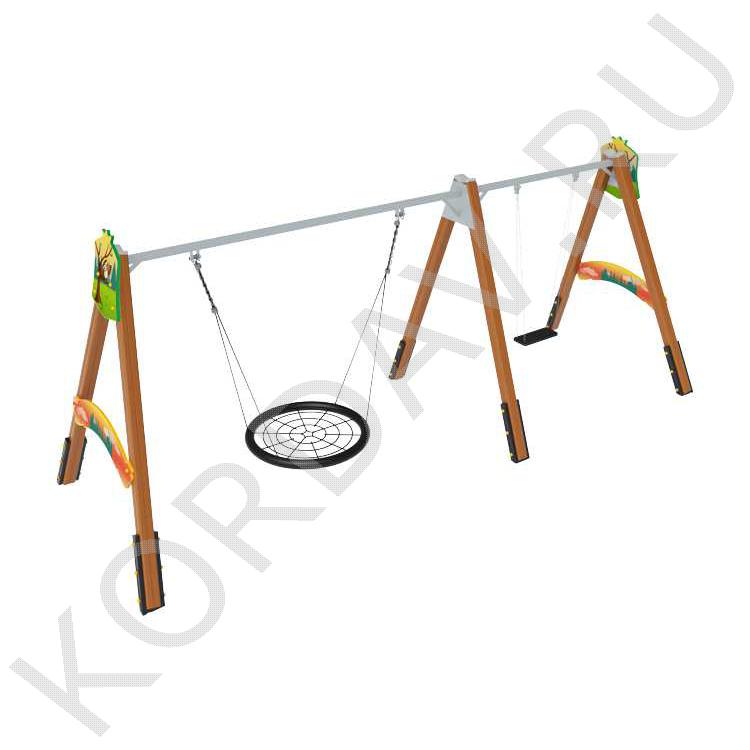 Диаметр сиденья — 1000 мм. Плетение внутри кольца выполнено из четырёхпрядного армированного каната диаметром 16 мм. Качели комплектуются подвесами из шестипрядного армированного каната. Длина подвесов — 1340 мм. Подвес из цепи. Цепь: короткозвеньевая, не калиброванного класса, прочность металла Т(8), диаметр сечения звена цепи 6 мм. Цепи соединены в единый подвес наконечником для крепления к перекладине качели. Наконечник выполнен из втулки с подшипниками и скобы.